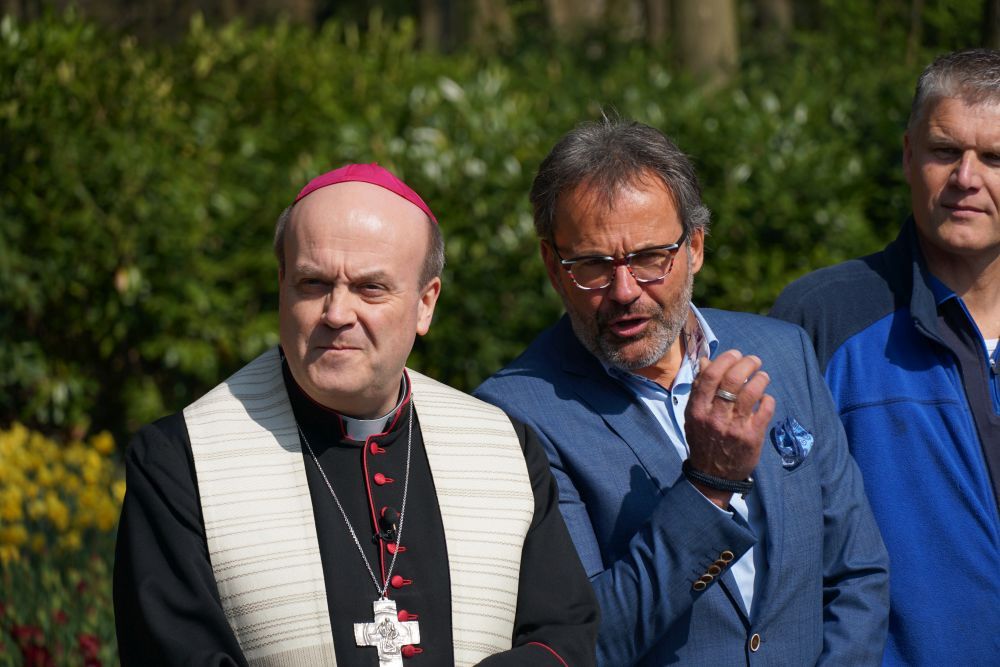 Mgr. Van den Hende zegende op dinsdag 16 april de bloemen die op transpart gingen naar Rome. Pastoor Rochus Franken en diaken Iwan Osseweijer van de Willibrordusparochie vergezelden hem. Namens de Keukenhof heette Bart Siemerink welkom. Het was voor de derde keer dat de Keukenhof trotse gastheer is van het gebeuren.