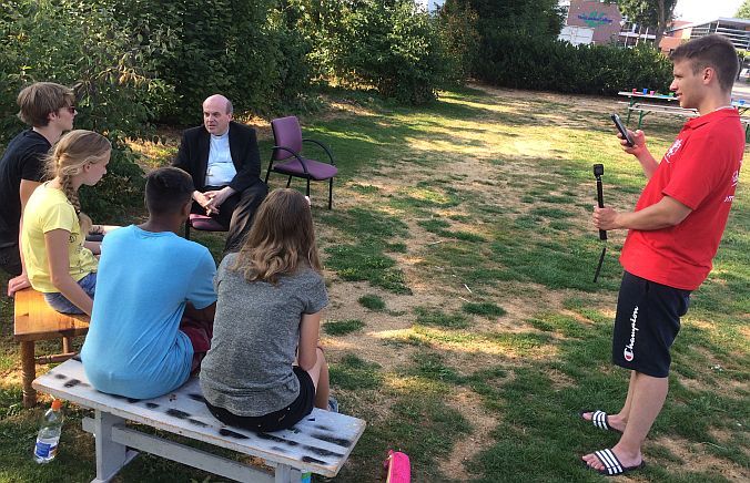 Voordat er wordt gegeten wordt er nog een vlog opgenomen met de bisschop. De tieners hebben vragen voorbereid en interviewen de bisschop. Hoe oud bent u? Hoe bent u bisschop geworden? Wat is een bisschop eigenlijk? Waar woont u en waar gaat u naartoe voor uw werk? Ze zijn onder de indruk van het aantal kerken en parochies in het bisdom als de bisschop uitlegt dat een bisschop moet besturen, vieren en bidden, de mensen moet leren kennen en zo goed mogelijk bij elkaar moet houden op de weg van het geloof.