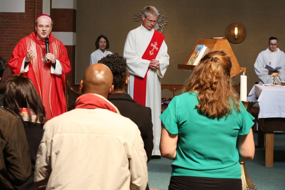 De jongeren nemen een palmtakje uit de mand en gaan dan in processie de kerk in. De uitgebreide evangelielezing tijdens de eucharistieviering vertelt over het lijden van Jezus vanaf het laatste avondmaal tot en met zijn sterven aan het kruis en de graflegging. “De stemming is gauw omgeslagen”, preekt de bisschop. “Was Jezus eerst de held, de koning van de vrede, die de stad binnenkwam, al gauw verandert de sfeer en staan mensen hem uit te jouwen. Jezus maakt zich klein. Hij laat zich niet voorstaan op zijn goddelijkheid maar neemt het bestaan aan van een slaaf. Hij gaat met de liefde van God de weg van vernedering.”