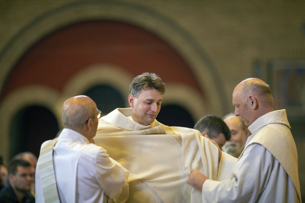 Voorafgaand aan de homilie spraken de wijdelingen uit: “Hier ben ik.” Bisschop Van den Hende: “Ik weet zeker dat jullie die woorden nog vaak zullen moeten herhalen. Niet alleen als je priester gewijd wordt en het weer in het liturgieboekje staat, maar ook op evenzovele andere momenten, wanneer parochies, wanneer parochianen en anderen een beroep op jullie doen. In momenten van vreugde en ook in momenten van verdriet, op momenten dat men zoekt naar God of een antwoord wil of verlangt naar de vrede van de Heer. Wat zou het goed zijn dat jullie ook dan zeggen: hier ben ik. Dat hoeven niet diezelfde woorden te zijn. Net zomin dat je meteen een tobbe mee moet nemen om altijd en overal de voeten te wassen. Er zijn heel veel manieren om dat ‘hier ben ik’ te vertalen naar de mensen die een beroep op je doen. En ook de voetwassing, door de knieën gaan omwille van je naaste, moet je op heel veel manieren steeds weer vertalen. Als je je oor leent en je hart om te luisteren, als je je handen uitstrekt om hulp te bieden en als je belooft te bidden, wanneer je voorgaat op de weg van het geloof en de liefde, wanneer je ook anderen in de Kerk herinnert aan de weg van de liefde van Christus die gediend wil worden.”