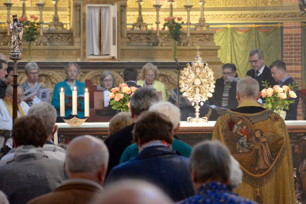 Na het rozenkransgebed volgen de vespers. Vicaris Egging is rector van de Basiliek van de H. Liduina en Onze Lieve Vrouw van de Rozenkrans en houdt een overweging. “Ik weet dat sommigen zich niet zo thuisvoelen bij de voortdurende herhaling van dezelfde gebeden, zoals dat hoort bij de rozenkrans. Maar je wordt gedragen door het ritme van het gebed. Dat je niet actief bidt, maar dat er in jou gebeden wordt.”