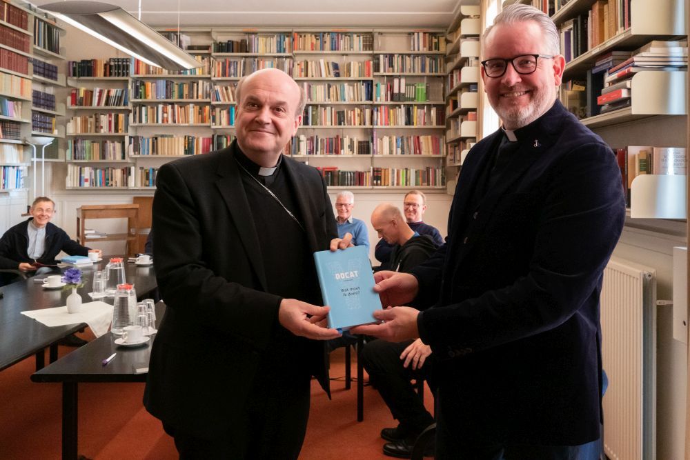 Bisschop Van den Hende overhandigt de DOCAT aan diaken Franck Baggen als coördinator van de diakenkring. (Foto: Bisdom Rotterdam)