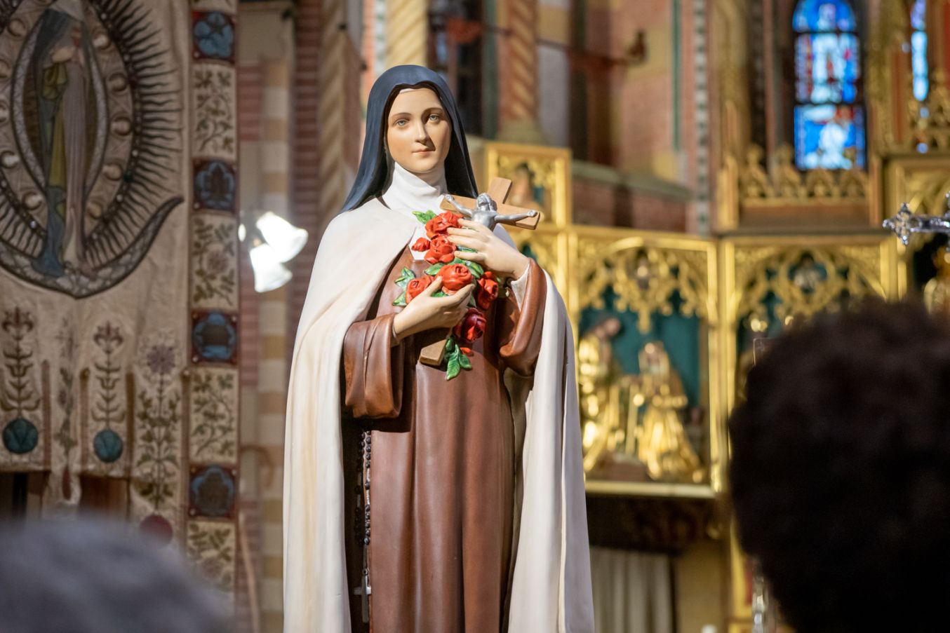 De bisschop vertelt over het gebed van Theresia van Lisieux en hij zegt: “Zij kan alleen met volharding blijven bidden om vrede en rechtvaardigheid en kan alleen de voorspreekster zijn van mensen die verlangen naar vrede, omdat zij allereerst op intense wijze van Jezus heeft geleerd wat barmhartigheid betekent.”